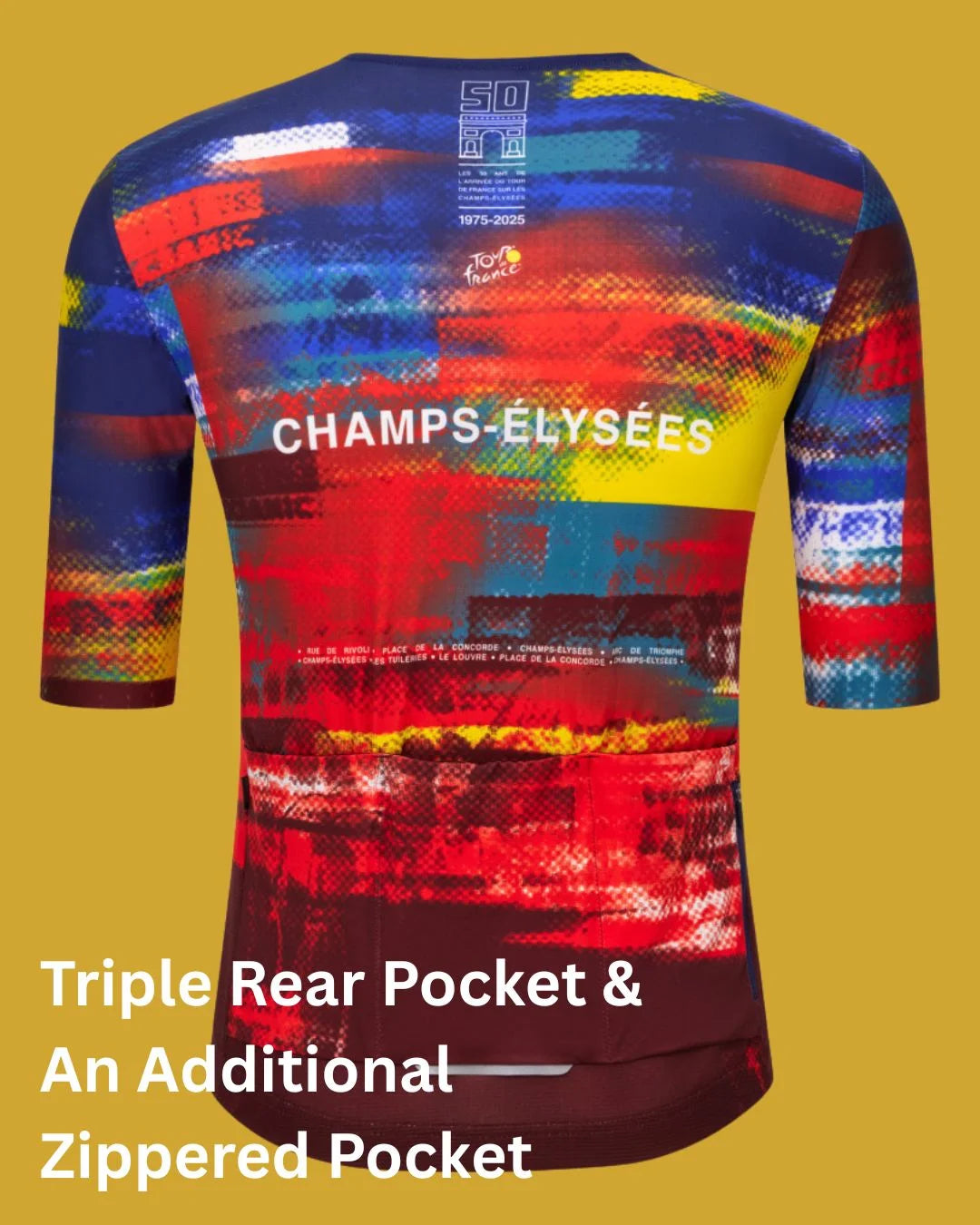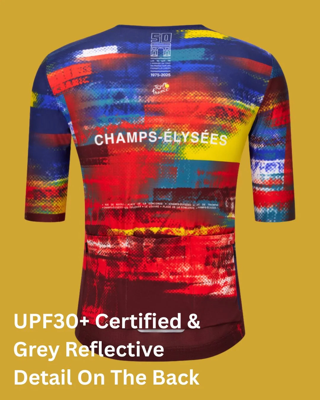 To celebrate 50 years of Arrivées on the Champs-Élysées, we created this special jersey that blends the vibrant energy of the era with modern performance technologies. The bold graphics and vivid colors evoke the electrifying atmosphere of the 1975 Tour, bringing a fresh touch of nostalgia to the modern peloton.