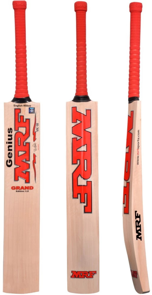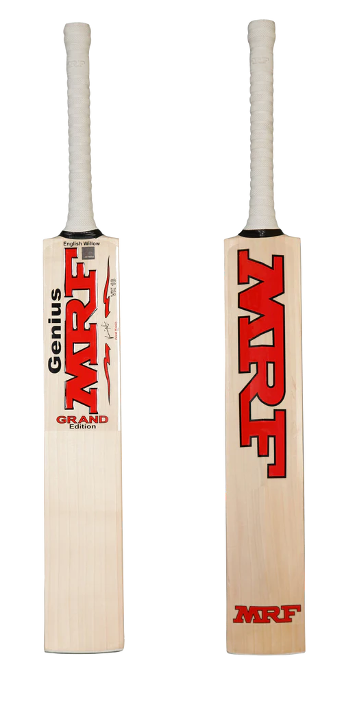 The MRF Genius Grand Edition English Willow Cricket Bat features Virat Kohli's 2023 Design. Crafted from Select Grade A English Willow, it has 8-12 Straight Grains. The Rounded Handle is made from Sarawak Combination Cane, designed for Shock Absorption & Power. The MRF Plain Bat Handle Grip ensures Control & Comfort. Edge Thickness is 38-42 mm & Weight 1160-1230 Grams. Comes with MRF Authenticity Hologram & MRF Padded Full Length Bat Cover.
