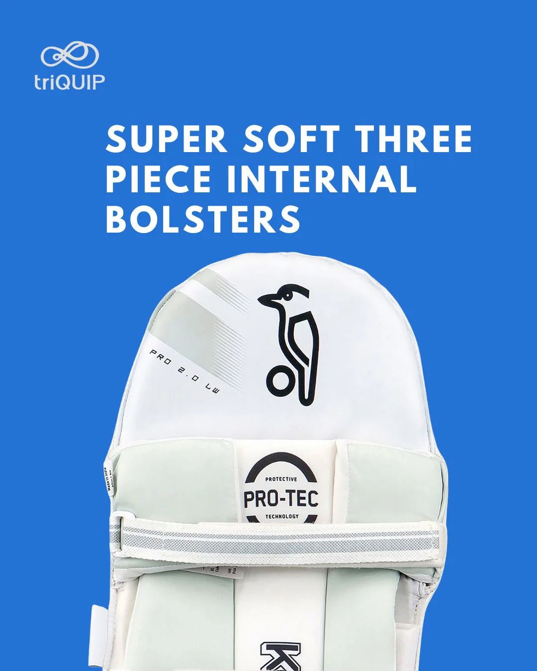 Made for players that like to move with speed, the Pro 2.0 Lightweight Batting Pad features Lightweight Bevelled Foam Styling, Pro Tec Internal Knee Roll, and Double Horizontal Bolster Reinforcement for a lighter, highly protective leg guard.