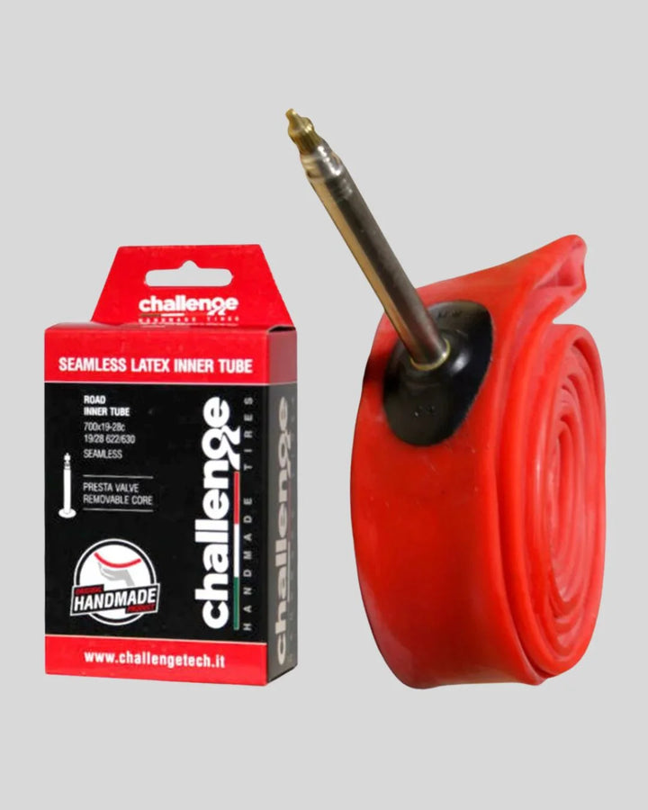 Challenge produces the only seamless 'one-piece' latex inner tubes on the market providing a smooth, balanced ride with no pucker or bump like those found on other tubes. Latex tubes are lighter, thinner and more flexible than a butyl tube, increasing your comfort, lowering your rolling resistance, and helping to prevent flats. The tube also includes a removable core Presta valve making them compatible with both inline and external valve extenders.