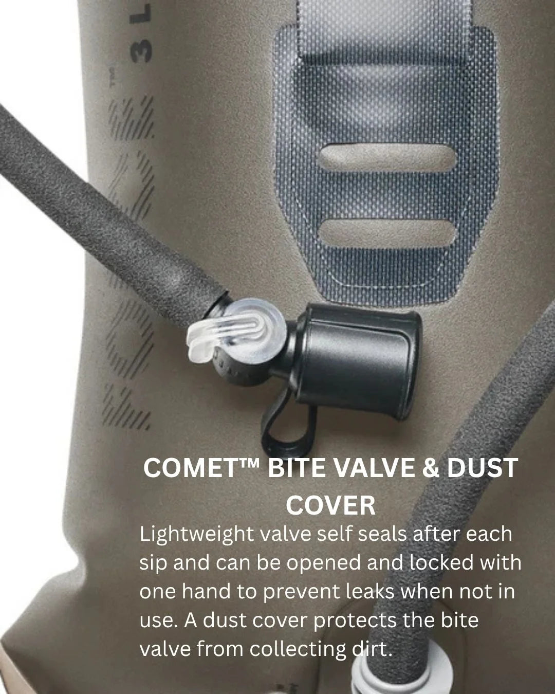 Comet Bite Valve & Dust Cover - Lightweight valve self seals after each sip and can be opened and locked with one hand to prevent leaks when not in use. A dust cover protects the bite valve from collecting dirt.