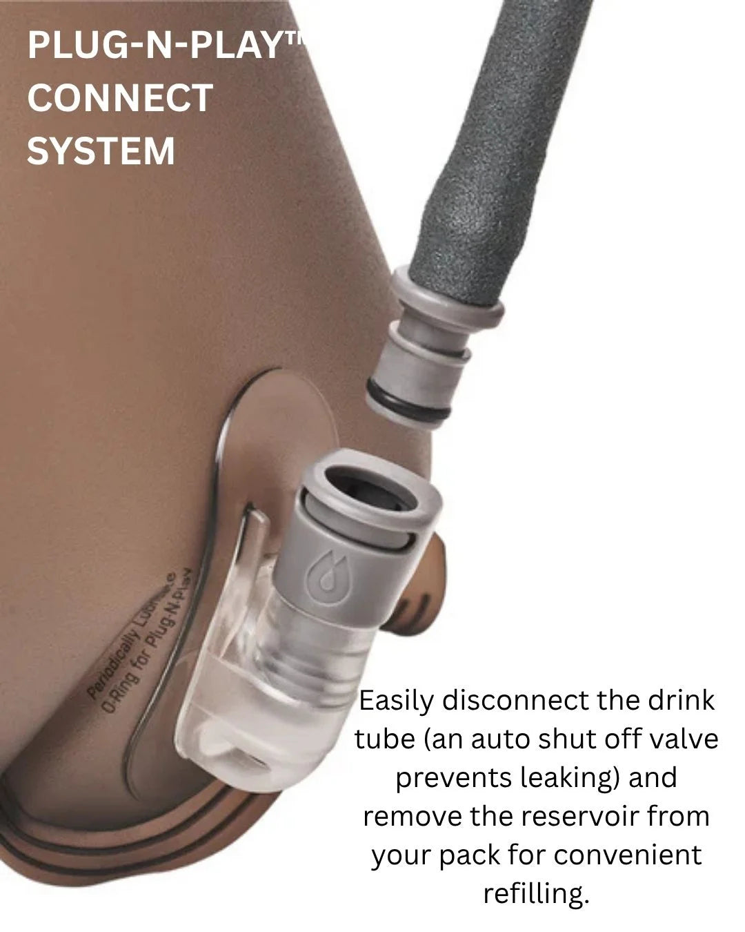 Plug-n-play Connect System - Easily disconnect the drink tube (an auto shut off valve prevents leaking) and remove the reservoir from your pack for convenient refilling.